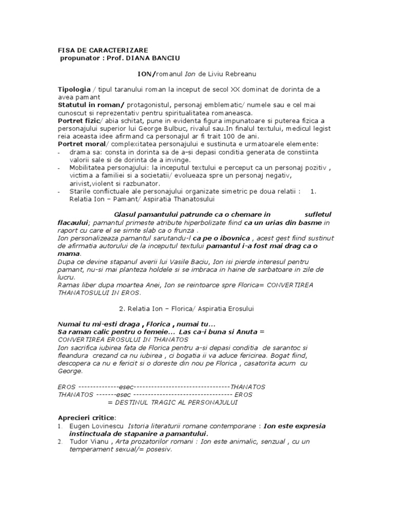 Doc Caracterizare Ion De Liviu Rebreanu Elena Grigorescu Academia Edu